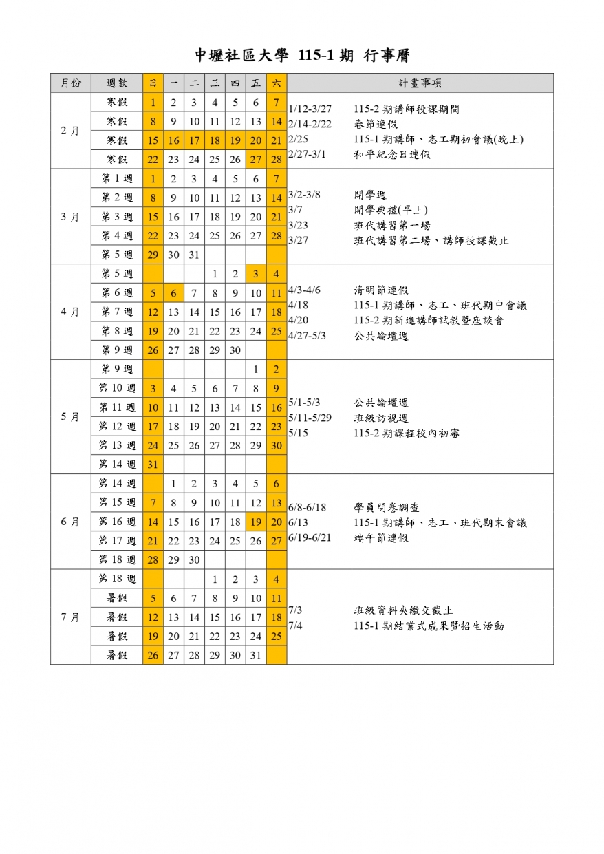 中壢社區大學行事曆